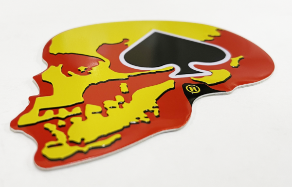This is a Metal Emblem with raised Text and Skully. It has an incredibly sticky adhesive backing, use with caution.